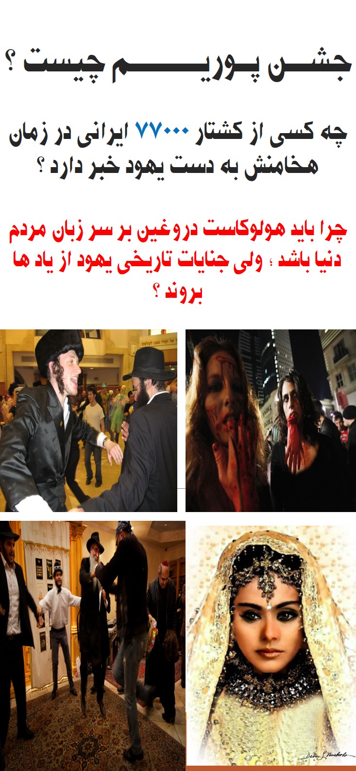 از جشن پوریم یهودیان چه می دانید؟ هولوکاست واقعی را یهودیان در کجا و علیه چه کسانی اجرا کردند؟ آیا از کشتار ده ها هزار ایرانی به دست یهودیان اطلاعی دارید؟ آیا روز "13 به در" نوروز و خروج از خانه ها ریشه در قتل عام ایرانیان باستان دارد؟ با گزارش ویژه مشرق از پایکوبی صهیونیست ها در سالروز کشتار ایرانیان همراه شوید